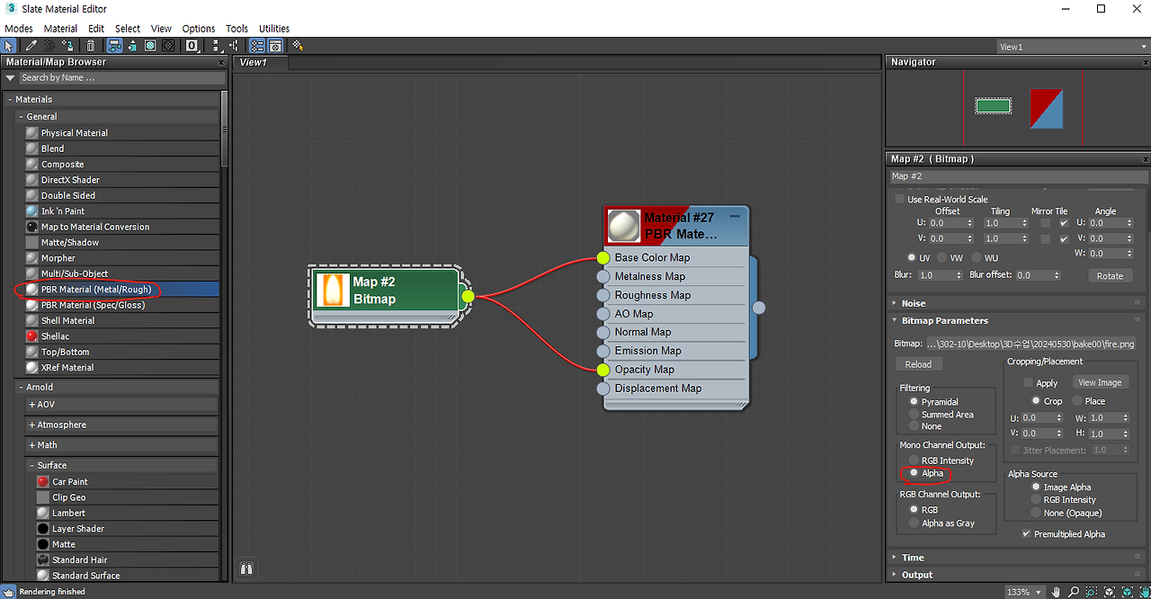PER Materal 머티리얼에 이미지를 베이스 컬러와 오파시티 맵에 노드를 연결해 준다.